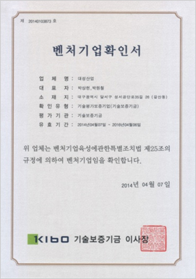 벤처기업확인서서 발행처 : 대구은행 |