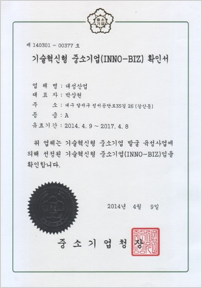 기술혁신형 중소기업 확인서 발행처 : 중소기업청 |